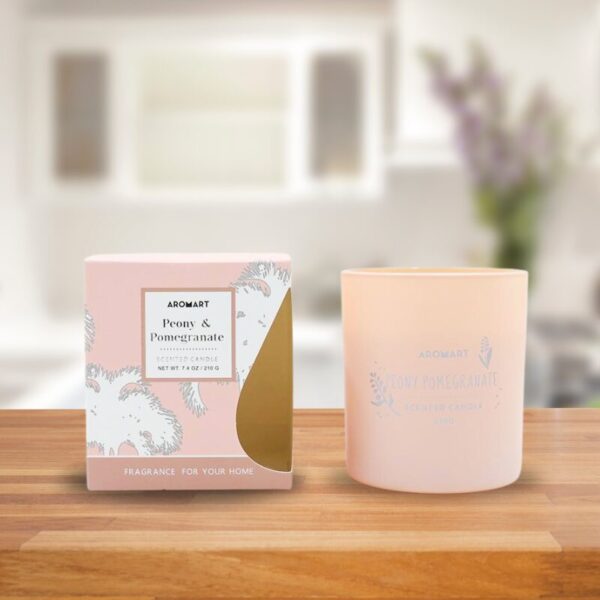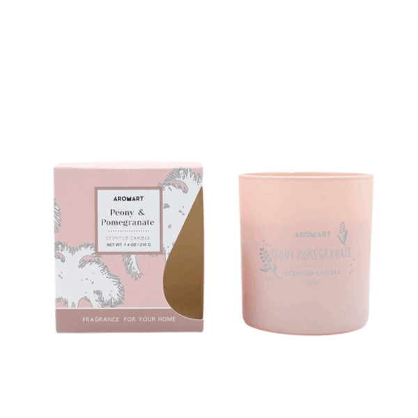 Immerse yourself in the luxurious aroma of Aromart Coloured Glass Scented Candle in Peony & Pomegranate.