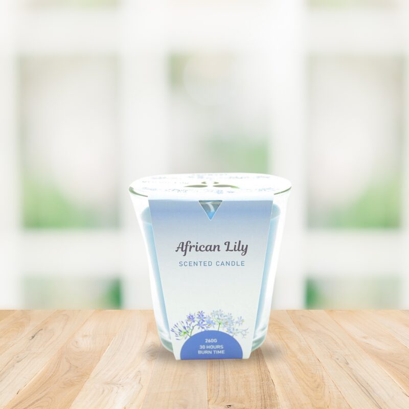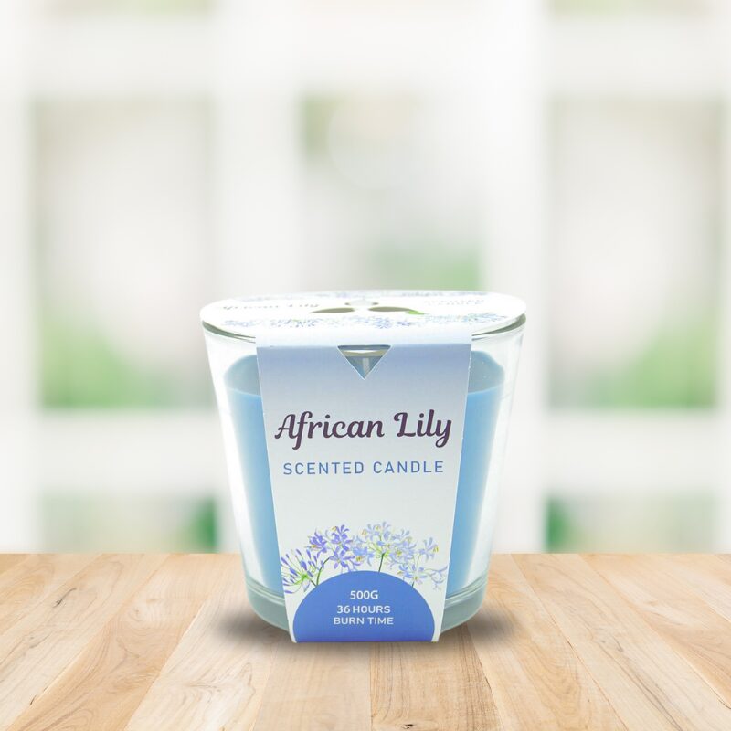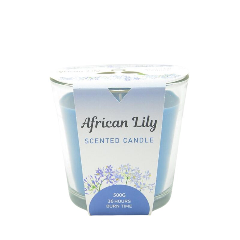 Elevate your senses and embrace the exotic charm of Africa with Aromart Glass Scented Candle 500g in African Lily, complemented by its soothing blue color.