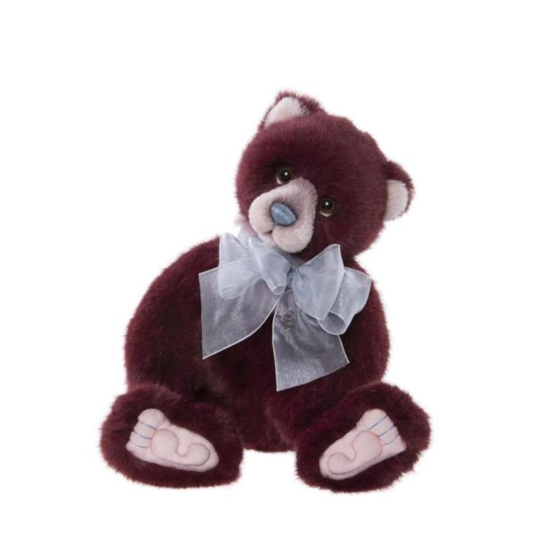 Meet Rummy, a rich burgundy plush bear that exudes warmth and sophistication. His features are accentuated with alpaca fur, making him one of our special Plumo bears. His beige muzzle and paws, alongside his hand-embroidered baby blue nose and organza ribbon, make him simply paw-fect.
