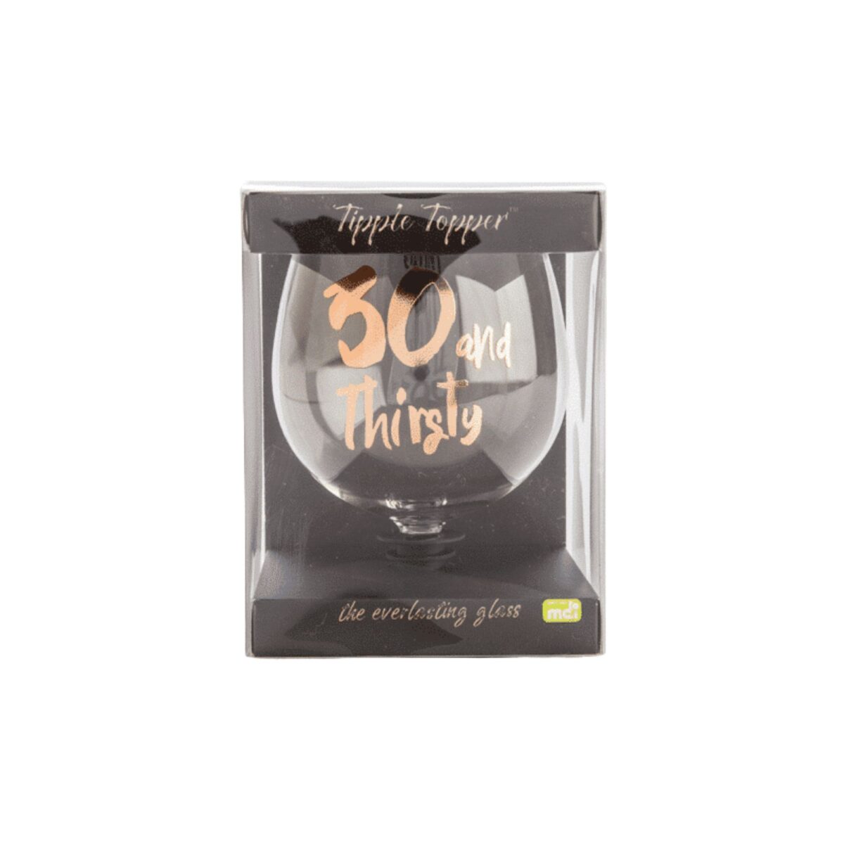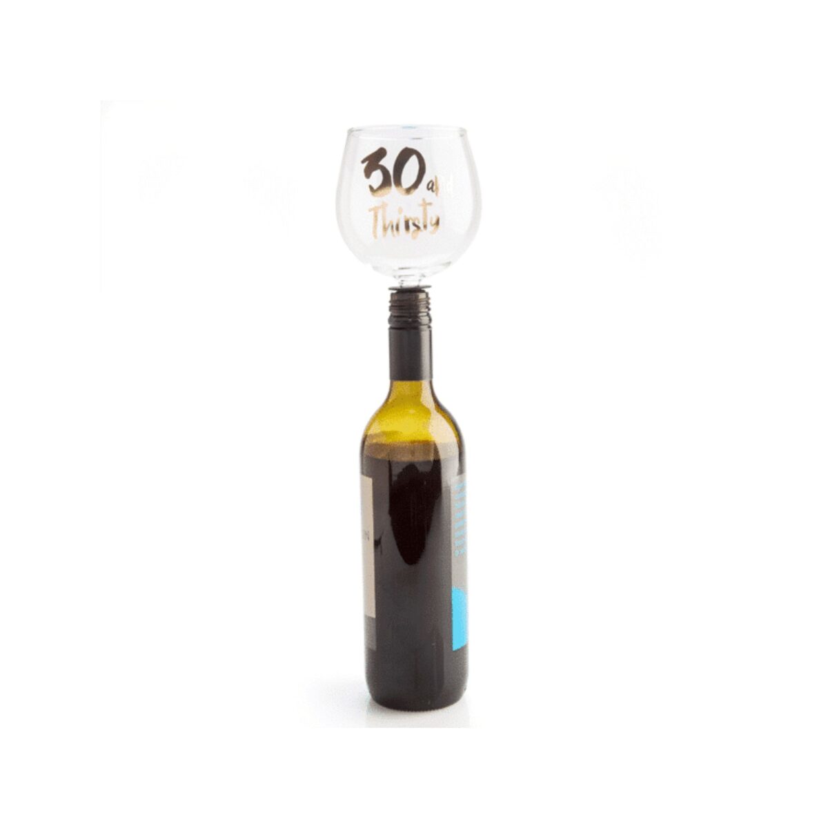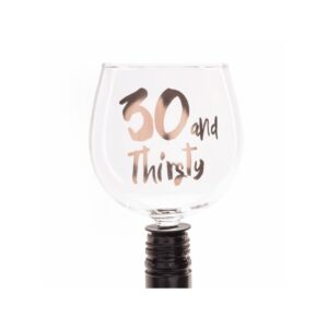 Design(s): Clear and everlasting wine glass with 30 and Thirsty in bold font