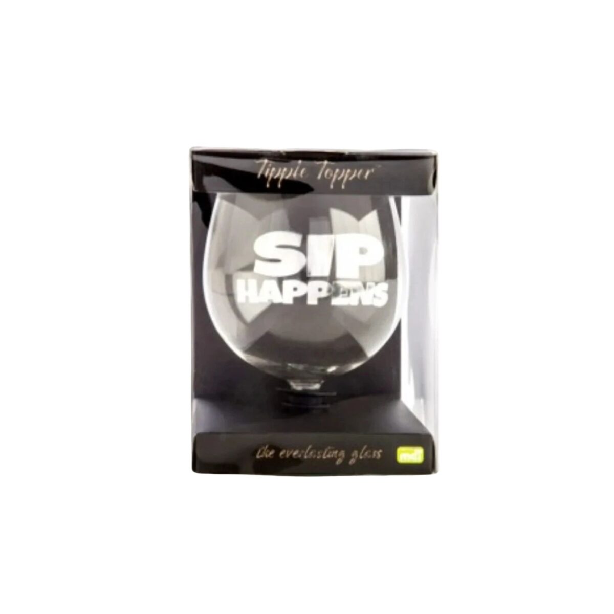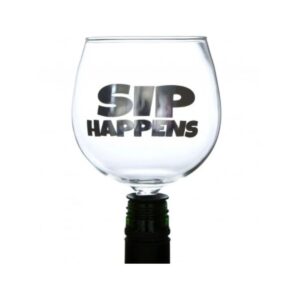 Design(s): Clear and everlasting wine glass with Sip Happens in bold font